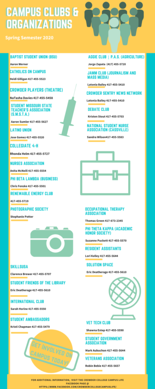 A list of clubs has also been printed on flyers and placed in the Student Center. For additional information, students are encouraged to visit the Crowder College Campus Life Facebook page printed