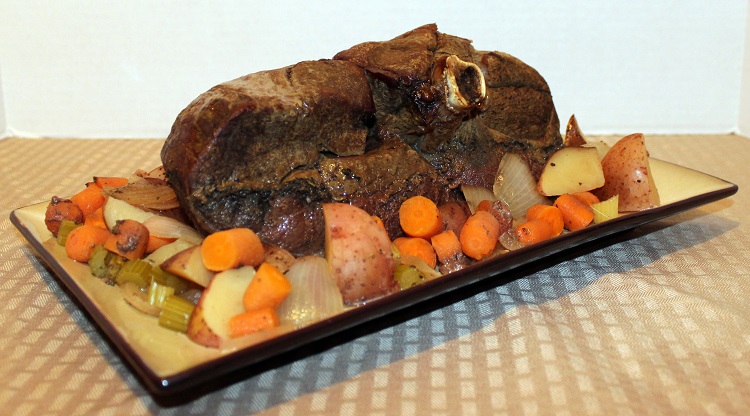 In a roaster pan, add cider and vegetable stock. Mix in basil, oregano, rubbed sage and seasoned salt. Place roast in broth and add apple, onion, carrots, celery and potatoes. Cook at 350° for 4 hours or until meat is tender.