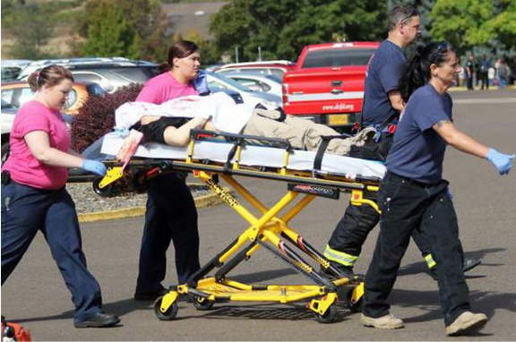 Paramedics rush a wounded person to an ambulance following the shooting spree at Umpqua Community College near Roseburg, Ore. on Oct. 1. Nine people were killed and nine others injured before the gunman killed himself following a shootout with police. Photo by Reuters/Michael Sullivan/The News-Review