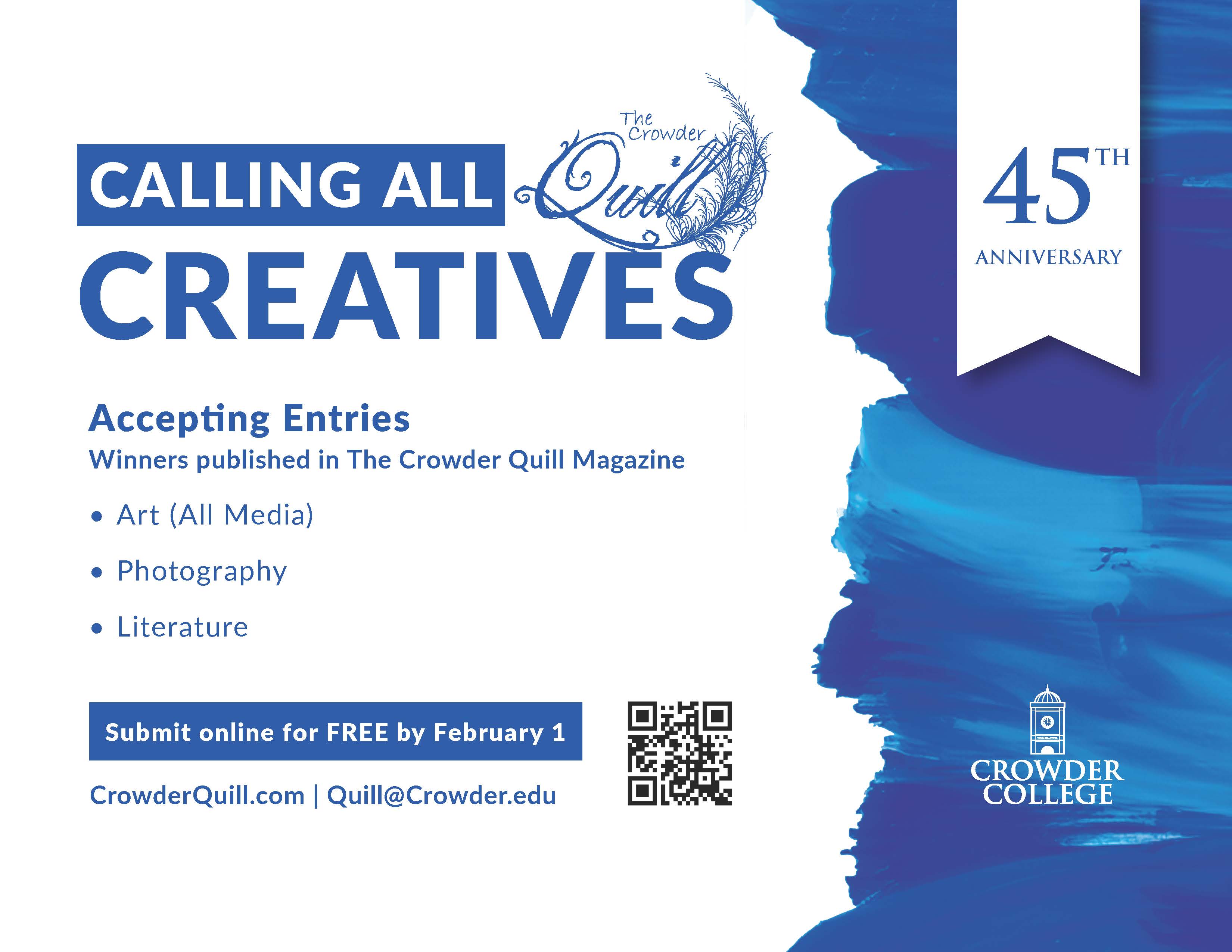 The Crowder Quill literary-art magazine of Crowder College is now accepting entries for its 45th anniversary contest, featuring categories in literature, photography and art.