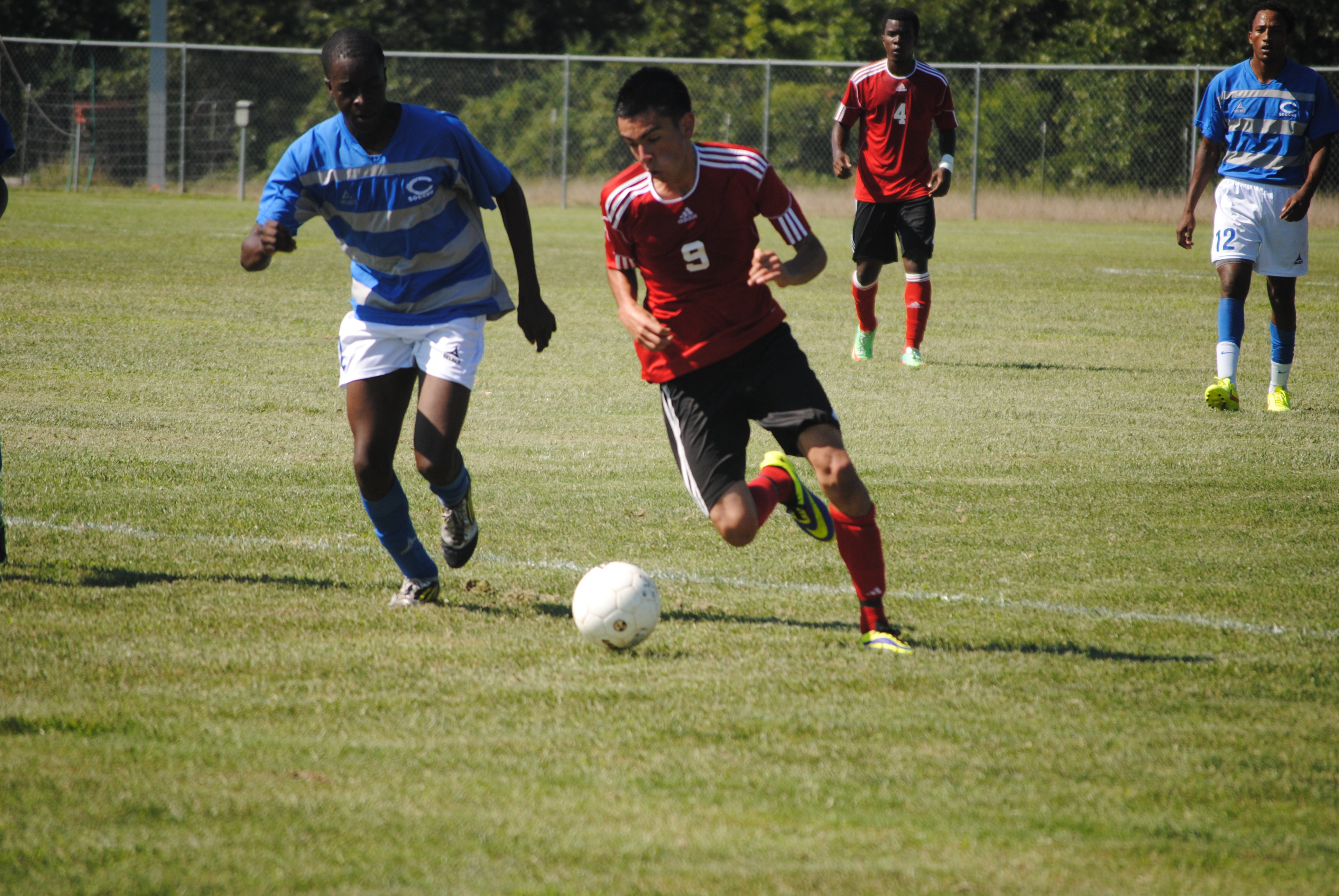Kenneth Aleri, midfielder, battles for the ball with an Allen County player during an Aug. 13 game at Roughrider field.