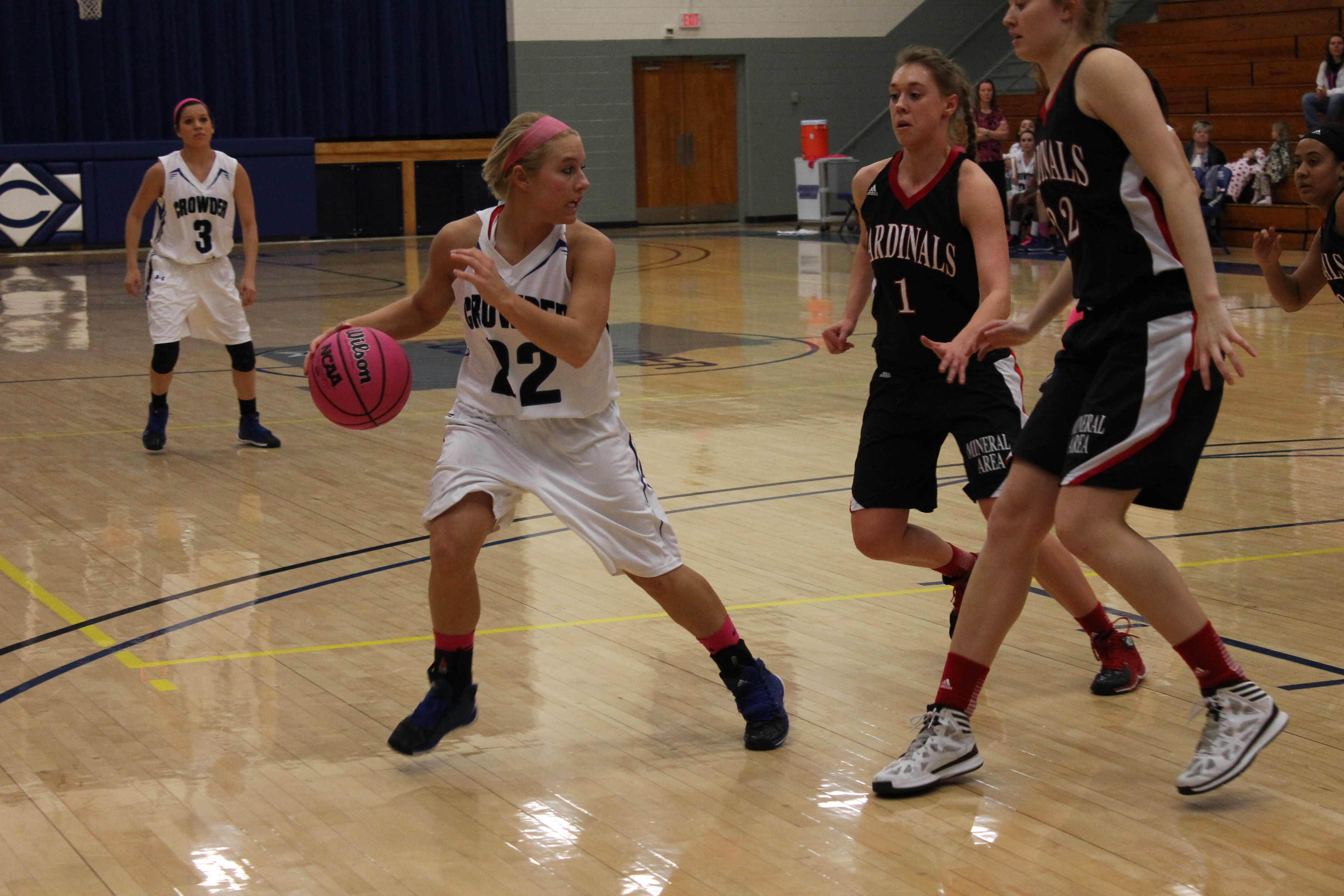 Lori Kleier, freshman #22 general studies major, keeps the ball away from two Mineral Area players during a Feb. 15 home game.